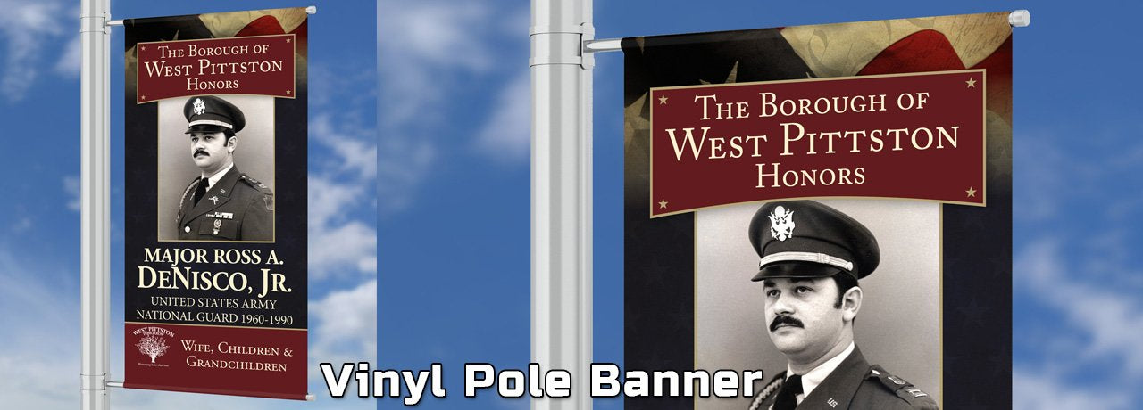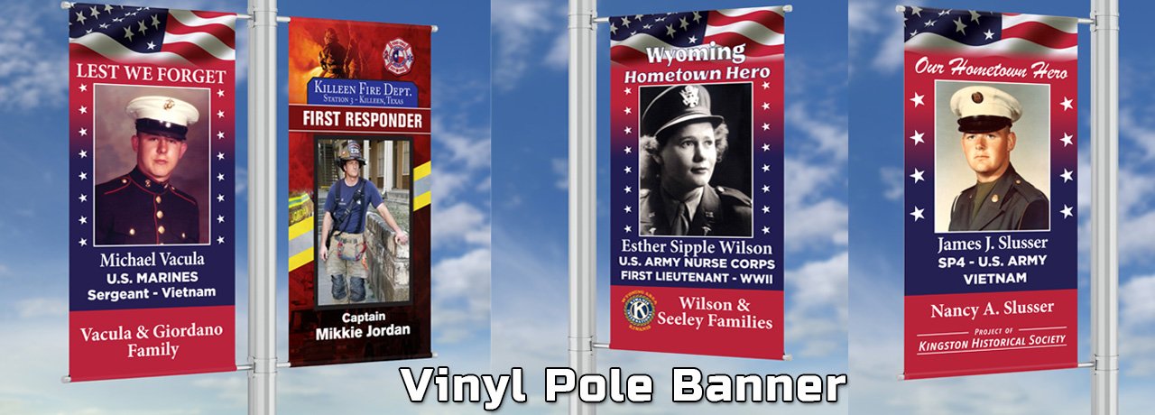 Honor Your Hometown Heroes with Double-Sided Pole Banners. Whether you are looking to honor a Hometown Hero, Veteran, or just spice up the downtown, these high quality vinyl pole banners are double-sided and come in various sizes. Please call for special group rates. And if your town is in need of replacements, please give us a call today.